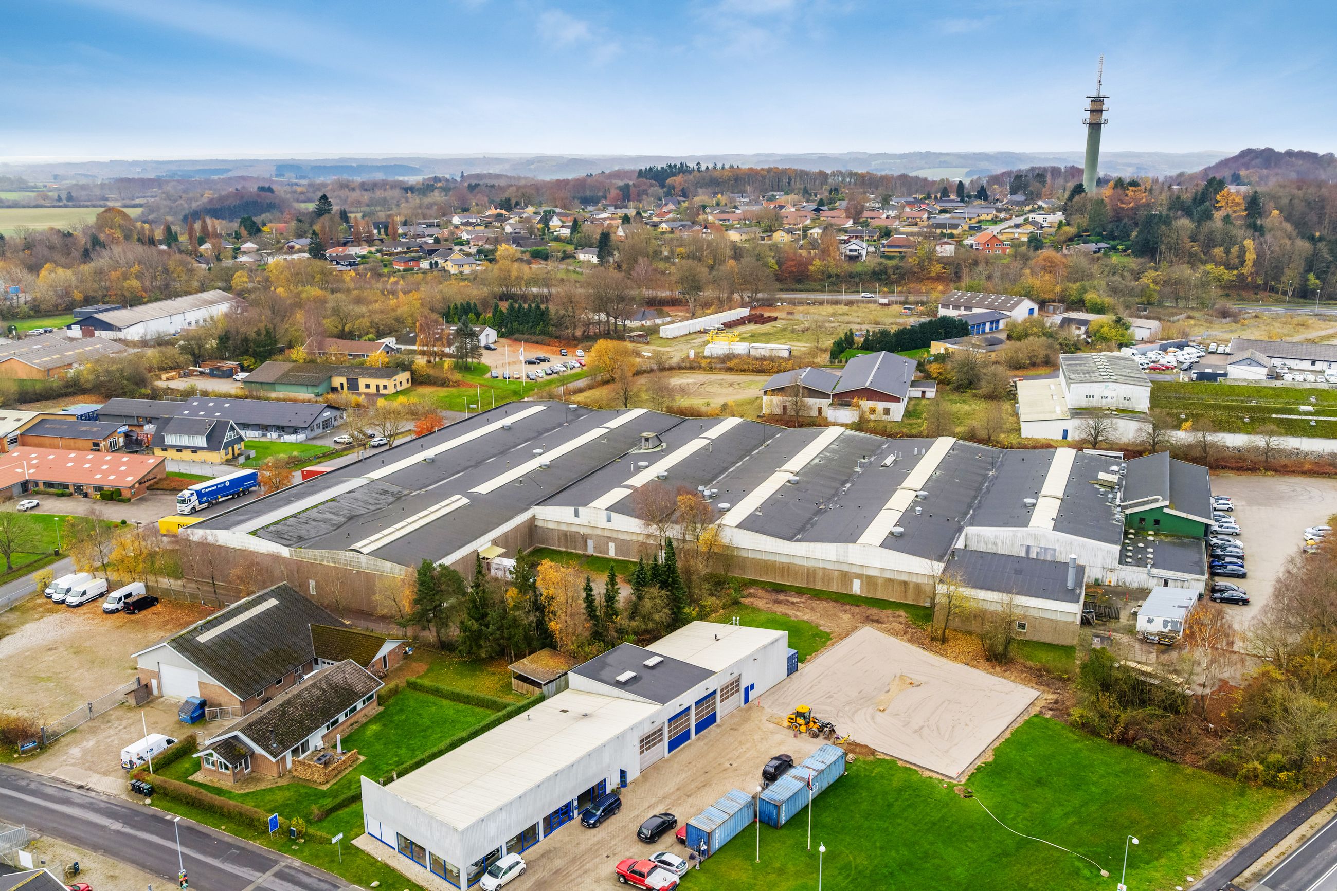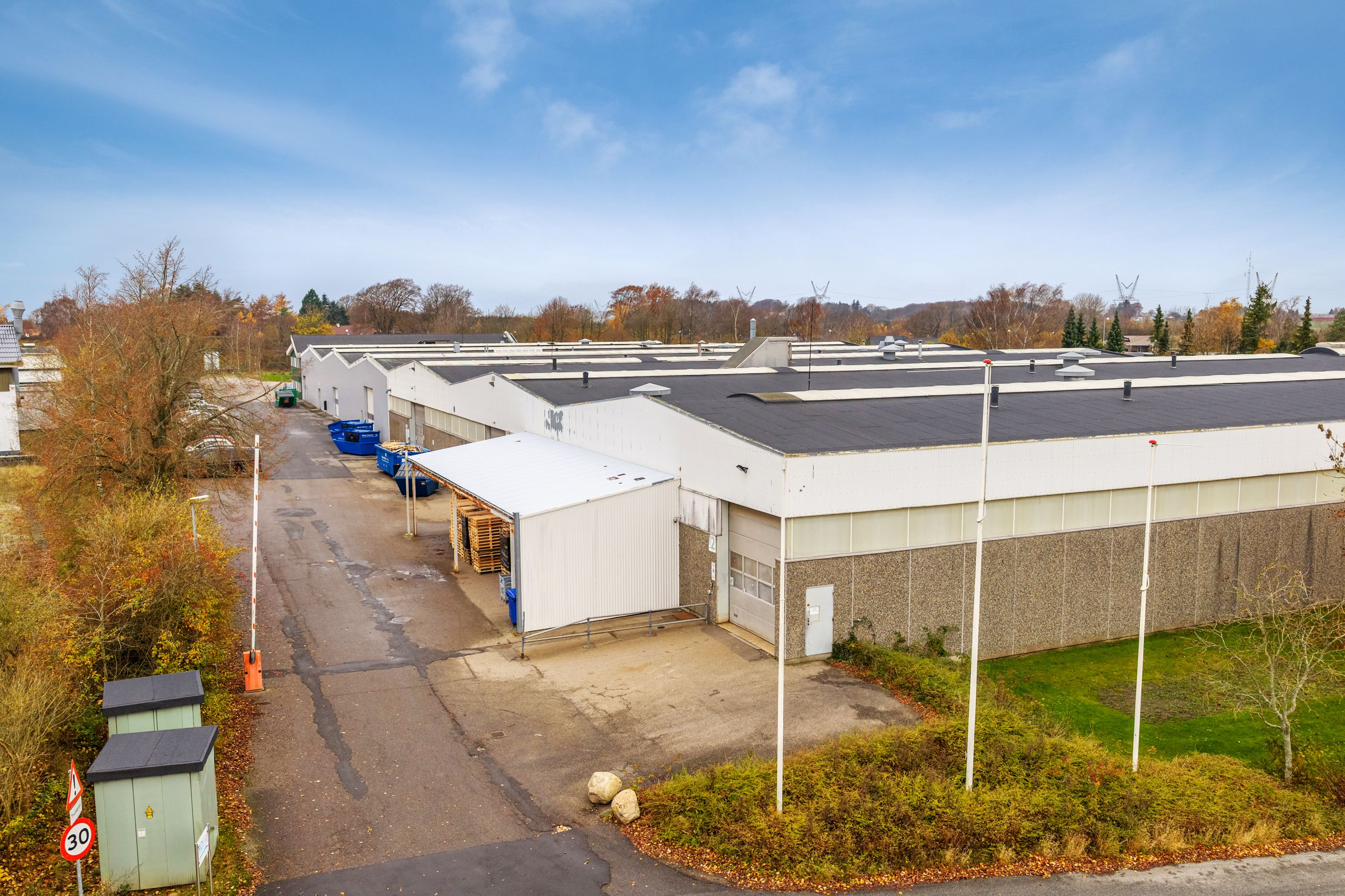 Velbeliggende Industrikompleks med Fleksible Haller og Moderne Faciliteter