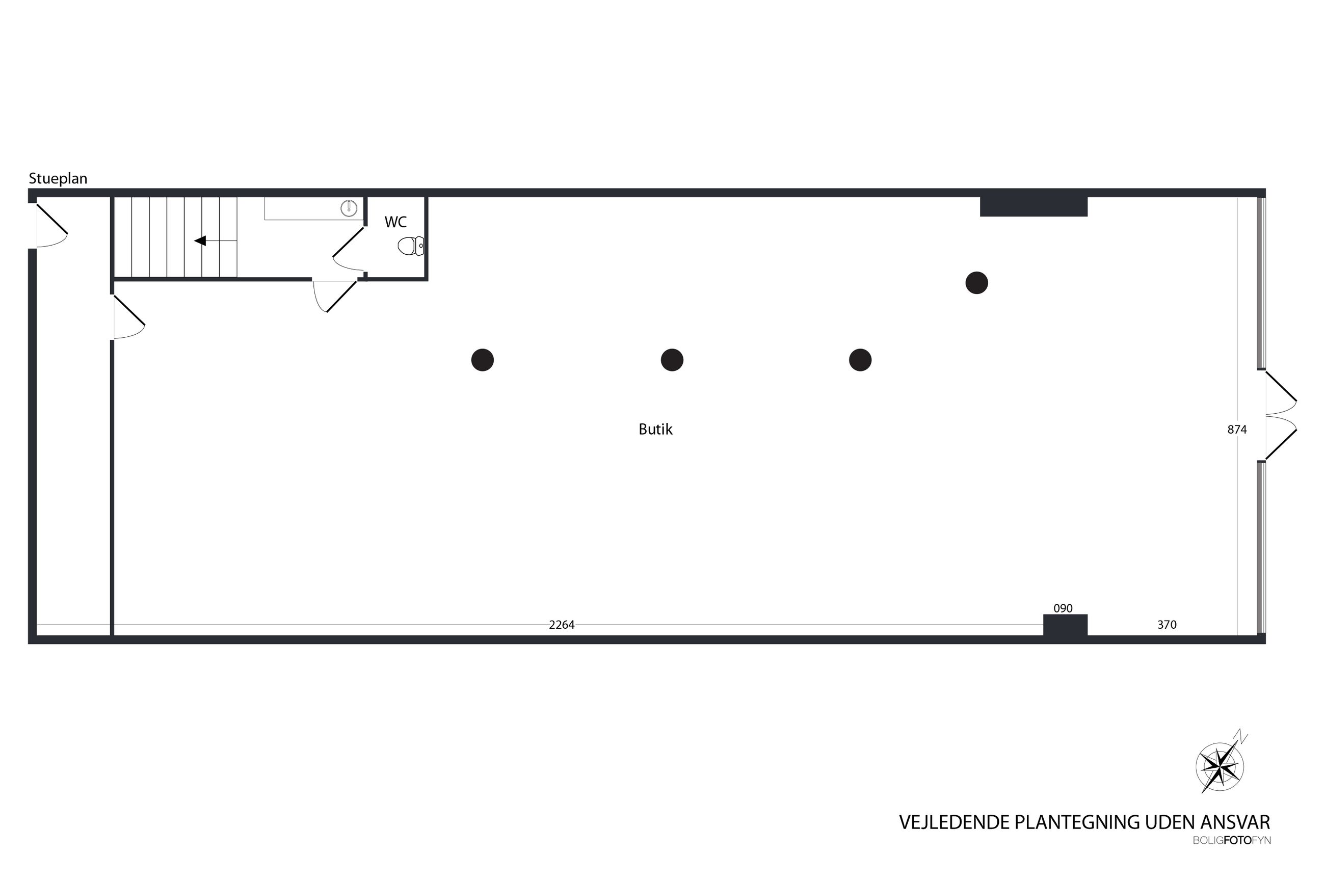 Ejendommen består af et lyst og åbent butikslokale i stueplan på 272 m², med store facade vinduer mod Kongensgade, der giver et flot lysindfald og en markant eksponering. Lokalet har en pæn, regulær butik, som kan indrettes efter behov til detailhandel, showroom eller kombineret kontor/butik.