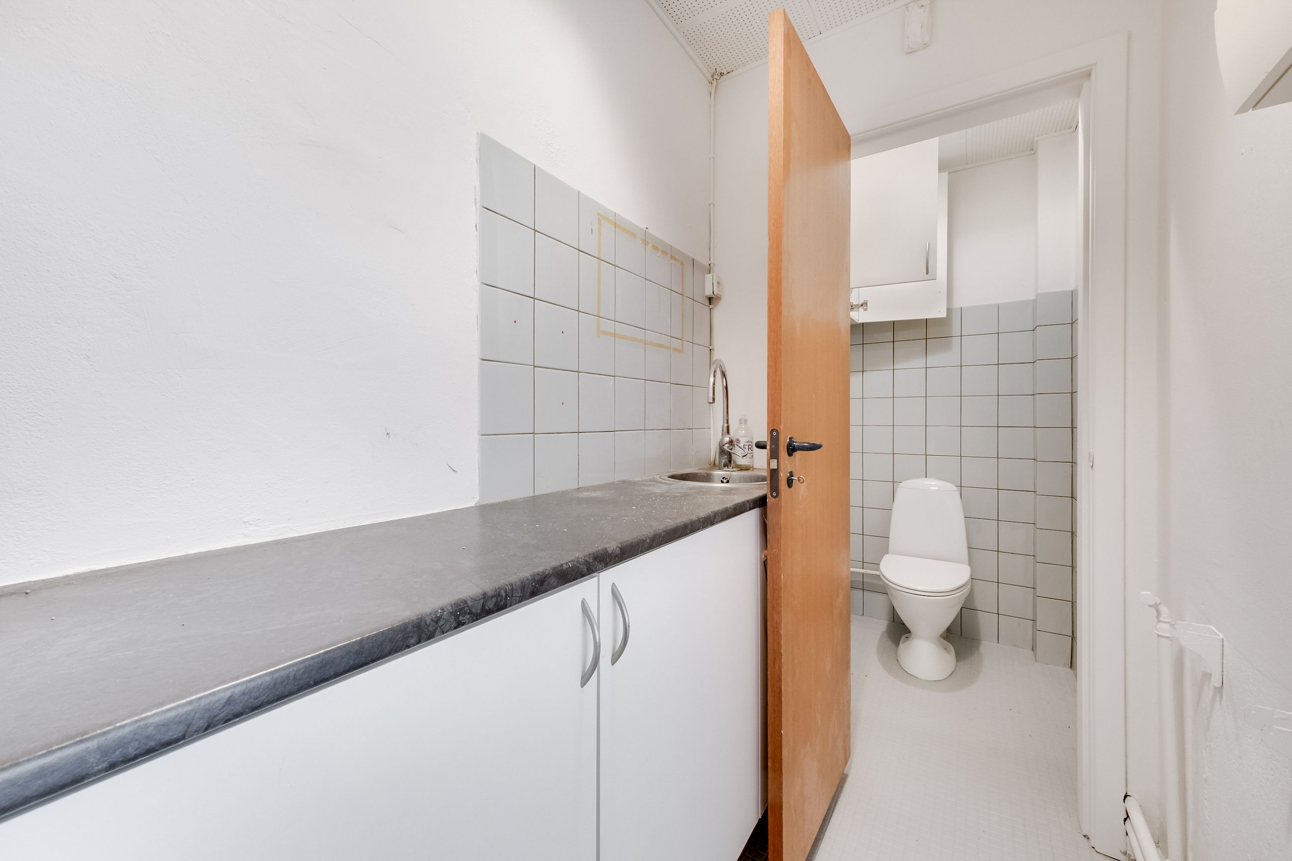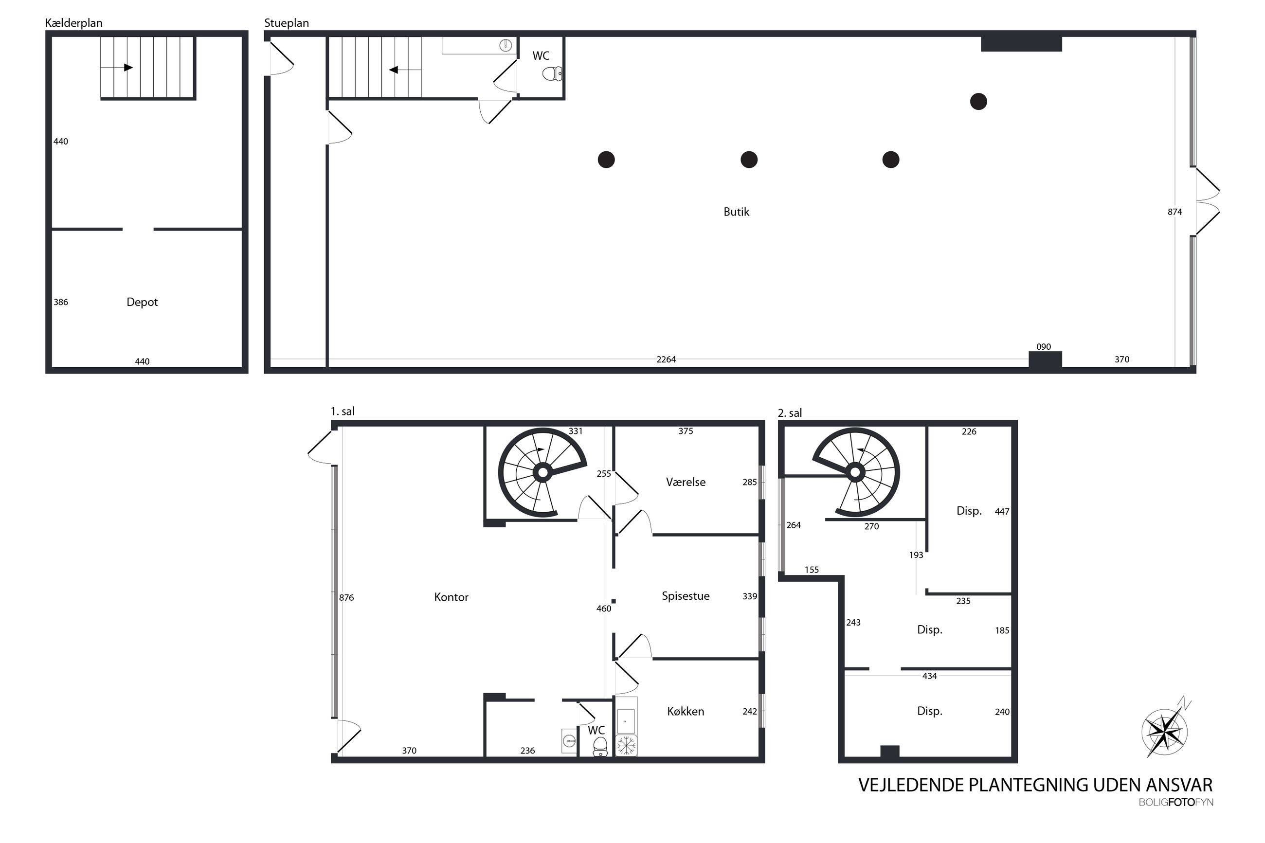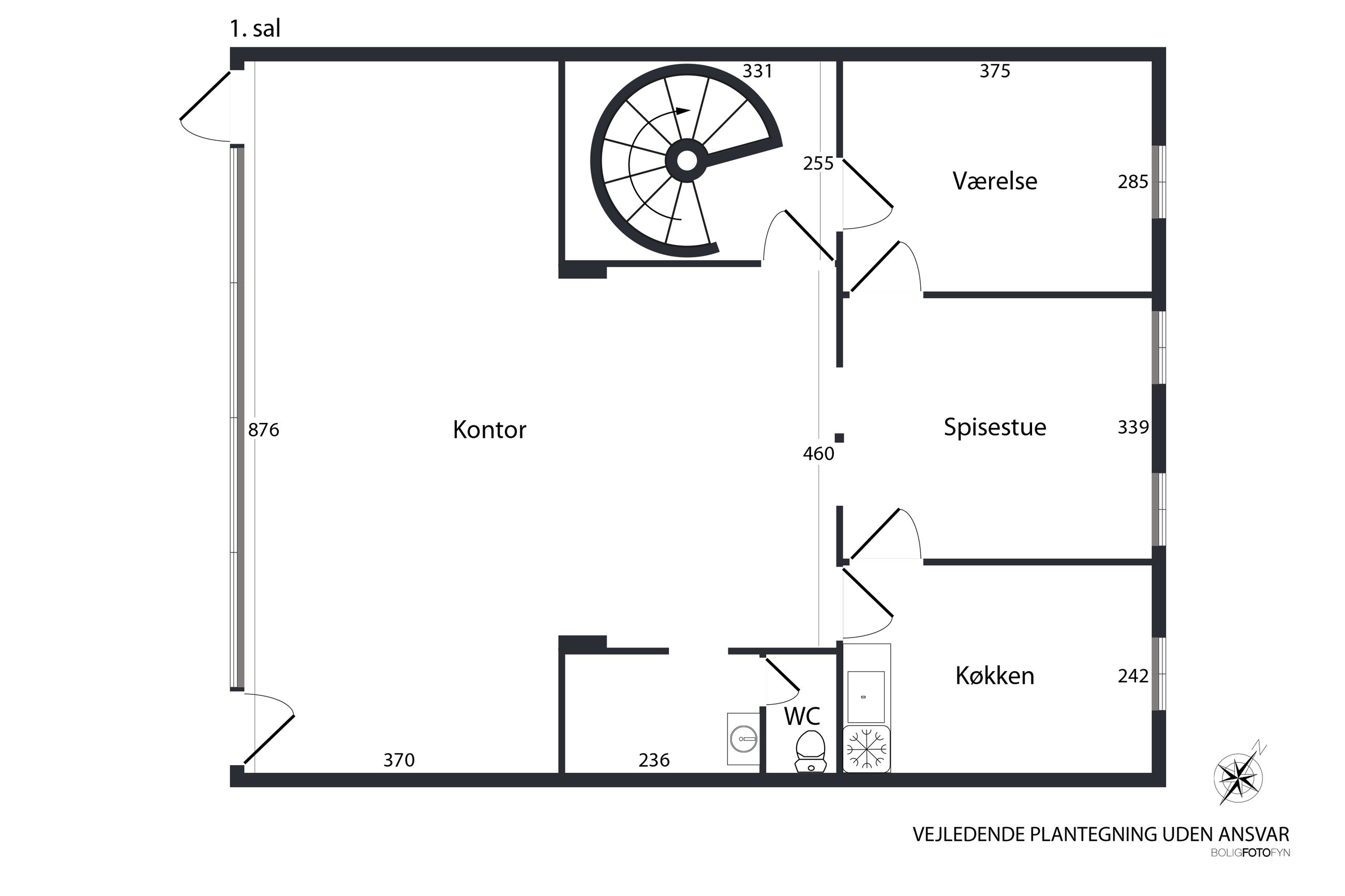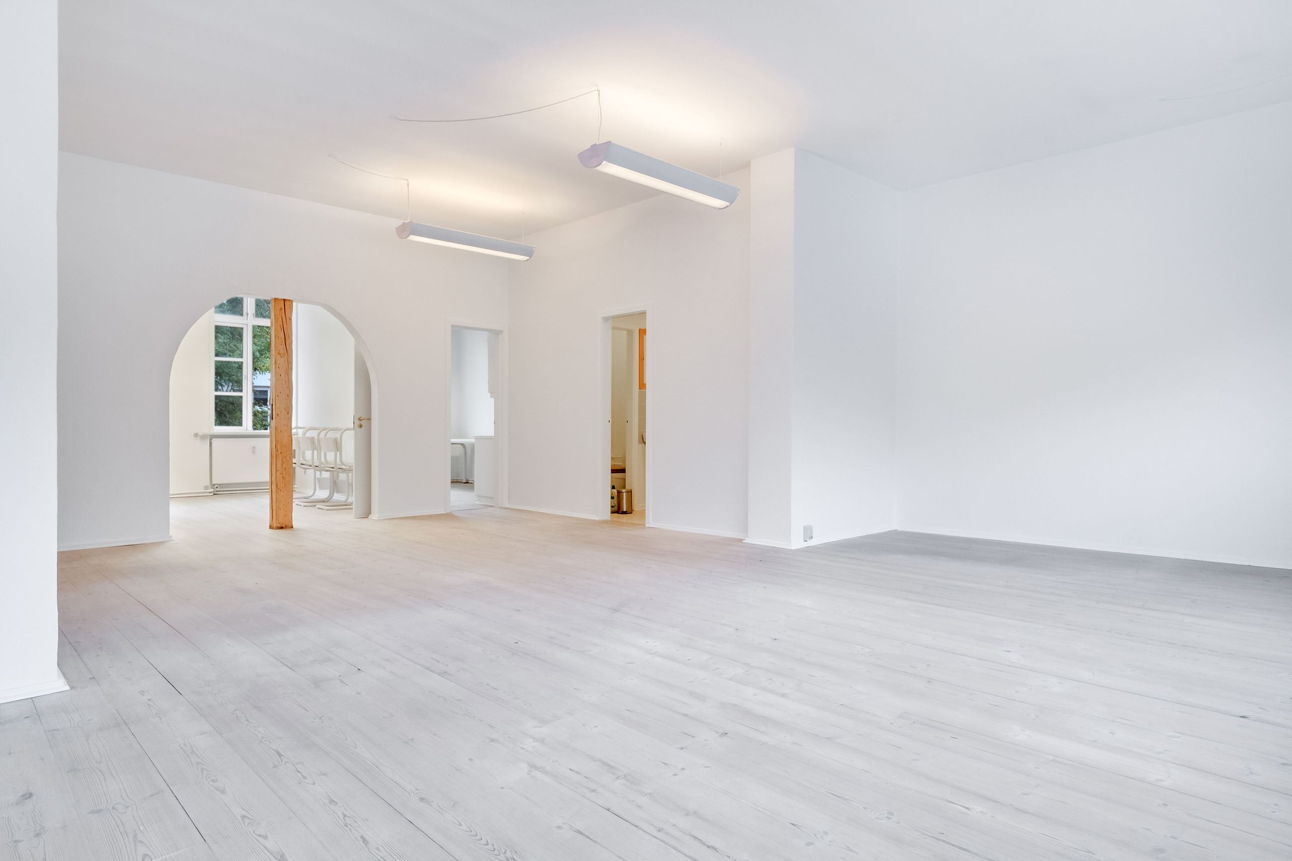 På 1. salen findes et kontorlejemål på 164 m² med separat indgang. Etagen indeholder køkken, badefaciliteter, flere kontorrum og en rummelig afdeling med udsigt mod gård- og bagside. Der er desuden adgang til et mindre lagerrum via en intern trappe. Etagen kan anvendes som kontor for virksomhedens administration eller udlejes separat som en selvstændig enhed.